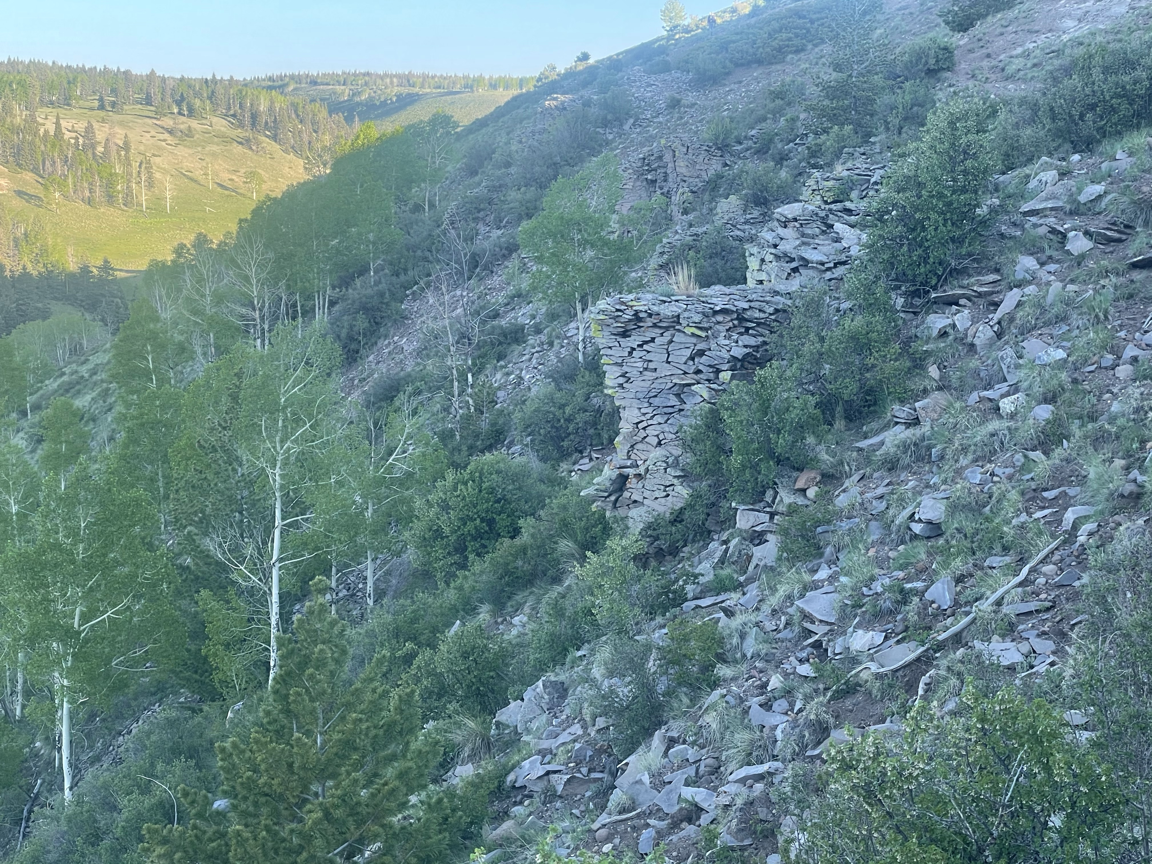 The trail out of the valley hugged the very edge of crumbling limestone cliffs covered in a rainbow of lichens. Spectacular hiking, but there were still bike tracks from the bike packers here- unfathomable to me. A dozen elk grazed below in the sun on the far side of the valley.
