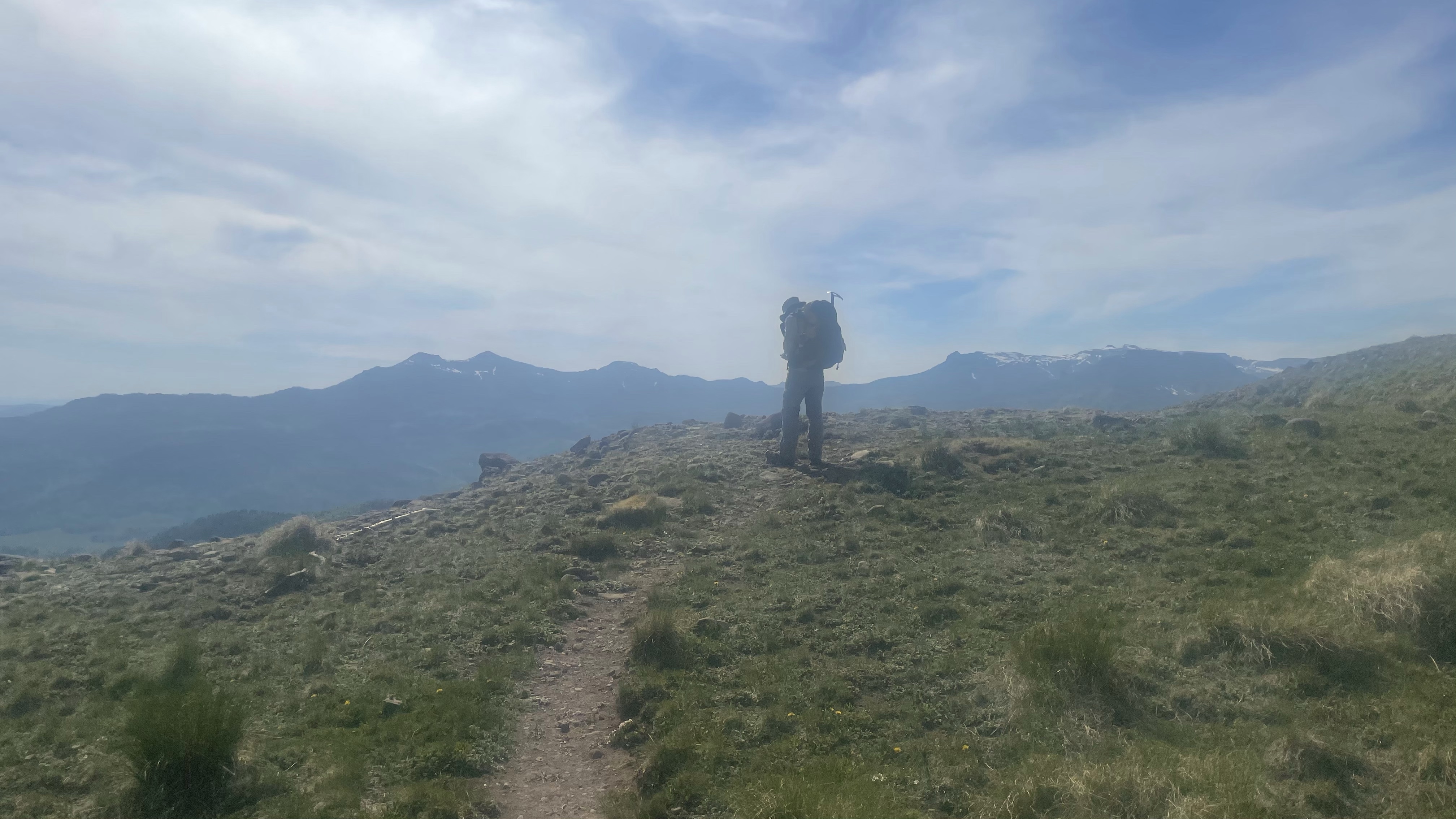 A long ridge led toward a knob jutting up into the long evening light, the lateness exaggerated by the thick smoke. Three elk darted across the trail right in front of Prana. We climbed slowly, methodically, into the wind, and topped our first 12,000 foot point, which also marked our entry into the South San Juan Wilderness.