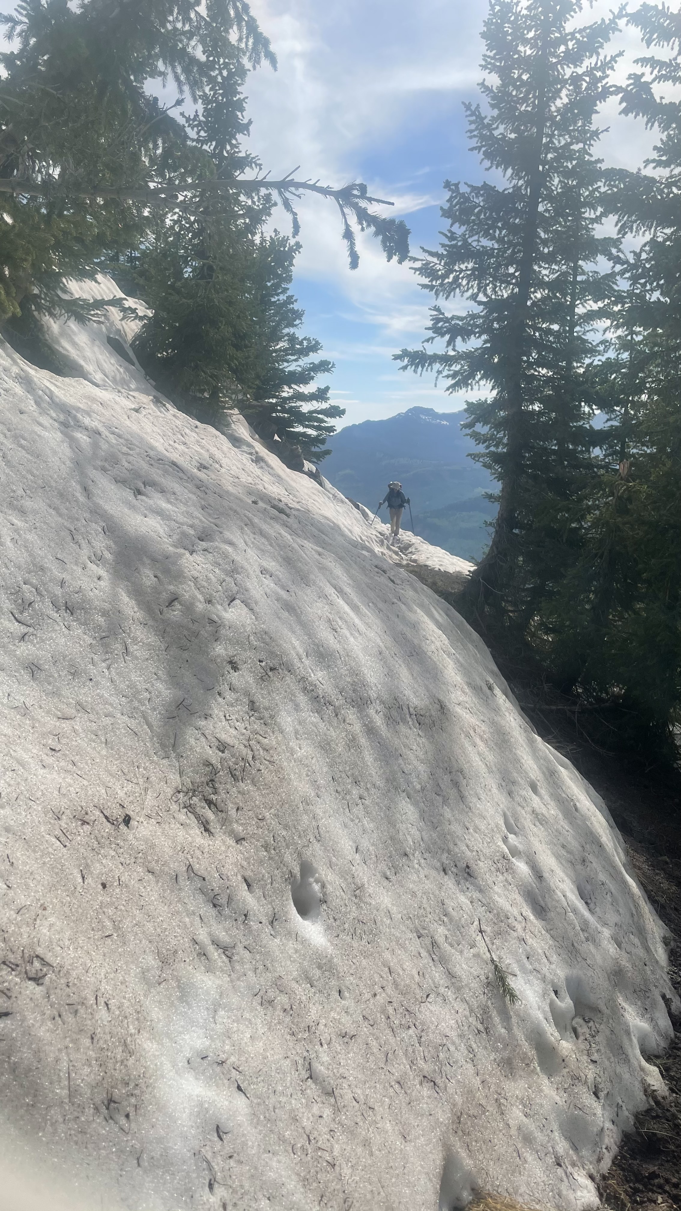 We reached our first snow on trail, got a little taste of the steepness we’d be faced with. Definitely don’t want to hit any north facing slopes too early in the day, I noted. I wished I had downloaded The Freedom of The Hills to read the finer tips on snow travel- reading obsessively always offers a small measure of empowerment in the face of uncertainty.