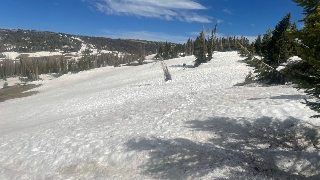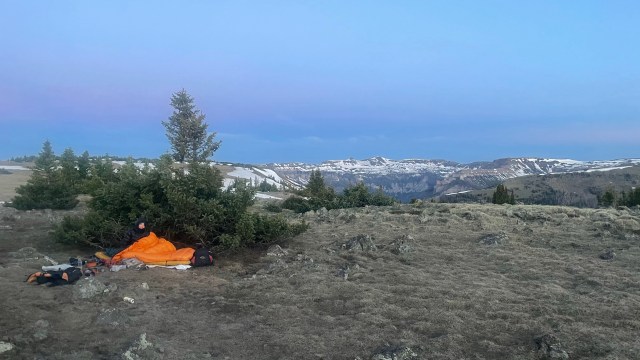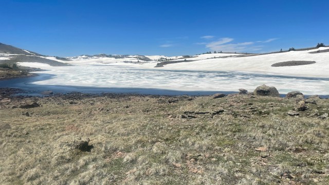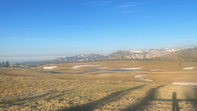 The ratio of mud to snow slowly shifted until we’d been on snow covered meadows for hours. The afternoon had warmed in the blinding intensity of the sun until most footsteps sank at least calf deep, more often to the knee, and I had the sensation gravity had increased, or that I was a stop action clay figure only advancing frame by frame. And always, the wind. We collapsed on a little island of dry ground, ringed by stunted firs, and ate and drank. My face was already fried from the sunrays ricocheting off the sparkling snow crystals, and I refused to believe how little mileage our entire afternoon’s effort had collected. “Oh my gosh,” I said, staring at the map, “how have we only come 5 miles in over 3 hours?” But, BUT, I thought, gazing around, listening to all the melt, to be here. Now, when the mountains themselves are stirring. In the summer the land would be blanketed in beauty, the wildflowers would bloom, and then autumn would unfurl its colors, seeming practically on the heels of spring; but this was the time the mountains were the headliners, going about their business, shaking off winter, before resuming their stoic poses as backdrop the rest of the year.