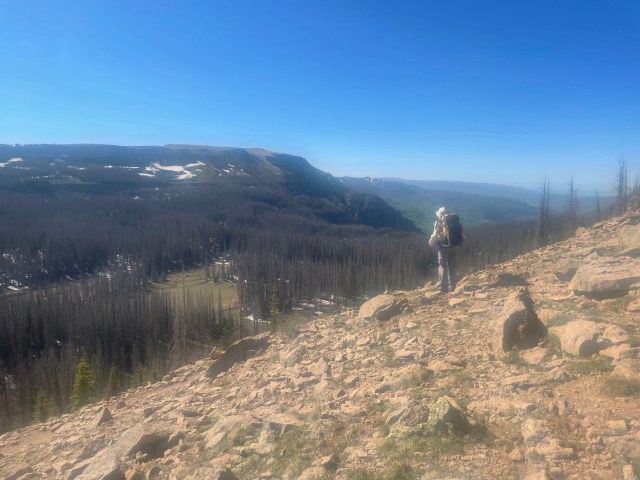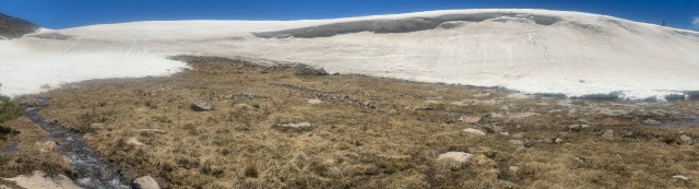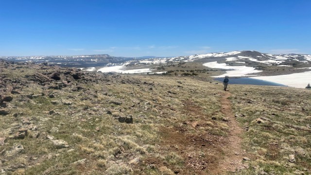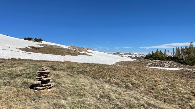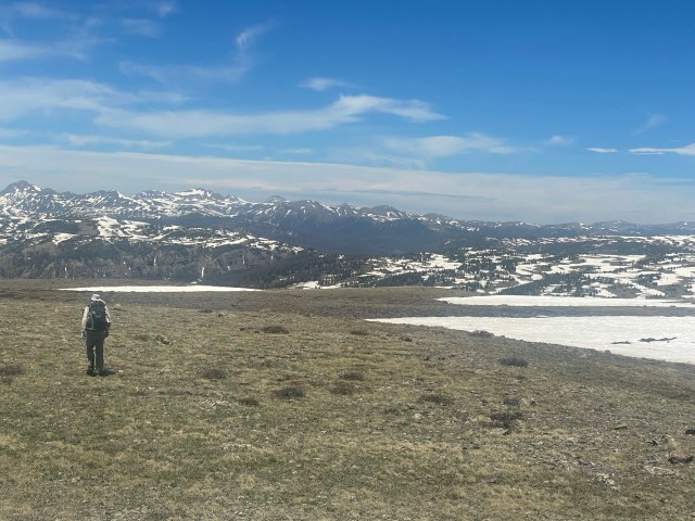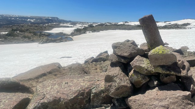 Our path traced the flat ridge top around the head of elk creek, alternating over dry ground, muddy tundra, and snowy meadows, cairns stacked tall leading the way. The shelves we were walking on were much wider than I’d expected: I’d pictured steep side hills and knife edge ridges, and in comparison, these were plazas in the sky.