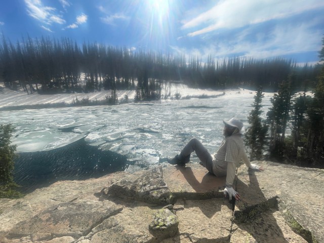 The wind howled and hollered, no change there from New Mexico, and when we reached Trail Lake we tucked into a semi-circle of krummholz, a sudden warm, still haven, and tucked into lunch. Floating, slushy ice still covered most of the lake, incongruent with the solar radiation bouncing off all the rocks and snow surrounding us, the sound of trickling water everywhere. What a privilege to see this land waking up out of winter, yawning, stretching, rolling over to greet the arrival of spring.