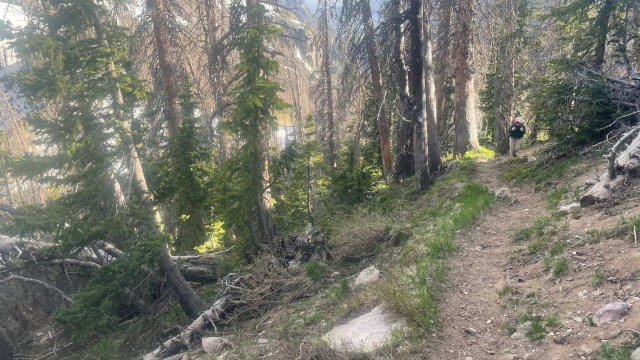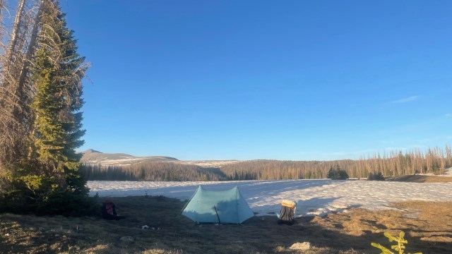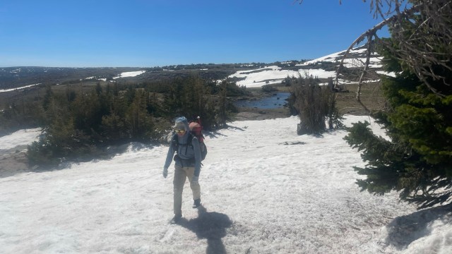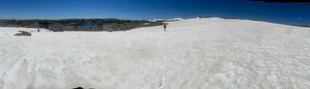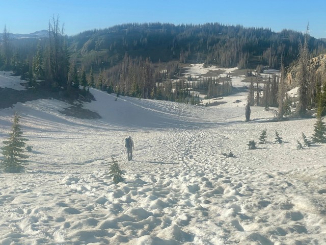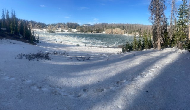 Onward. Between the new lofty altitude and the increasing wallowing, exhaustion crept in. Blue Lake was our destination, the next in a series of bite-size mini-goals, and we reached the far side of the valley preceding it close to dinner time. The official trail rimmed the valley, staying on contour with the lake, but it hugged a steep north-facing slope into thick trees, a recipe for deep, sloppy snow that we’d barely had to contend with yet. The bottom of the valley, by contrast, was a crater of open muddy ground, and by cutting down for a snow reprieve, we would intersect a trail to the lake that had partially melted out, ascending the far, and blessedly south-facing, side of the valley. I voted for that route instantly, and, although I could tell he was disappointed to not be toiling mightily along the red line, after a reconassaince revealed no other footprints existed on the buried official route, Prana agreed.