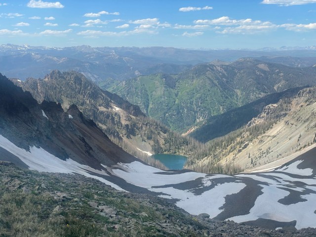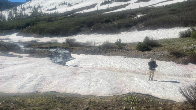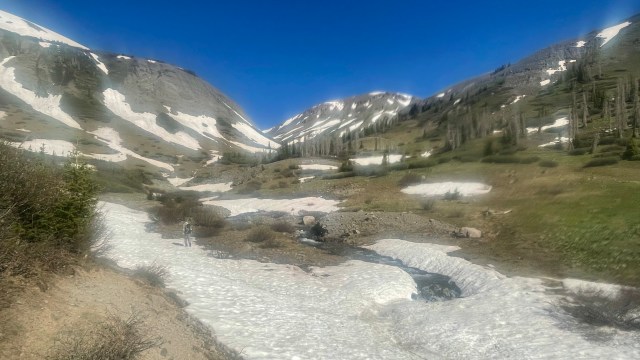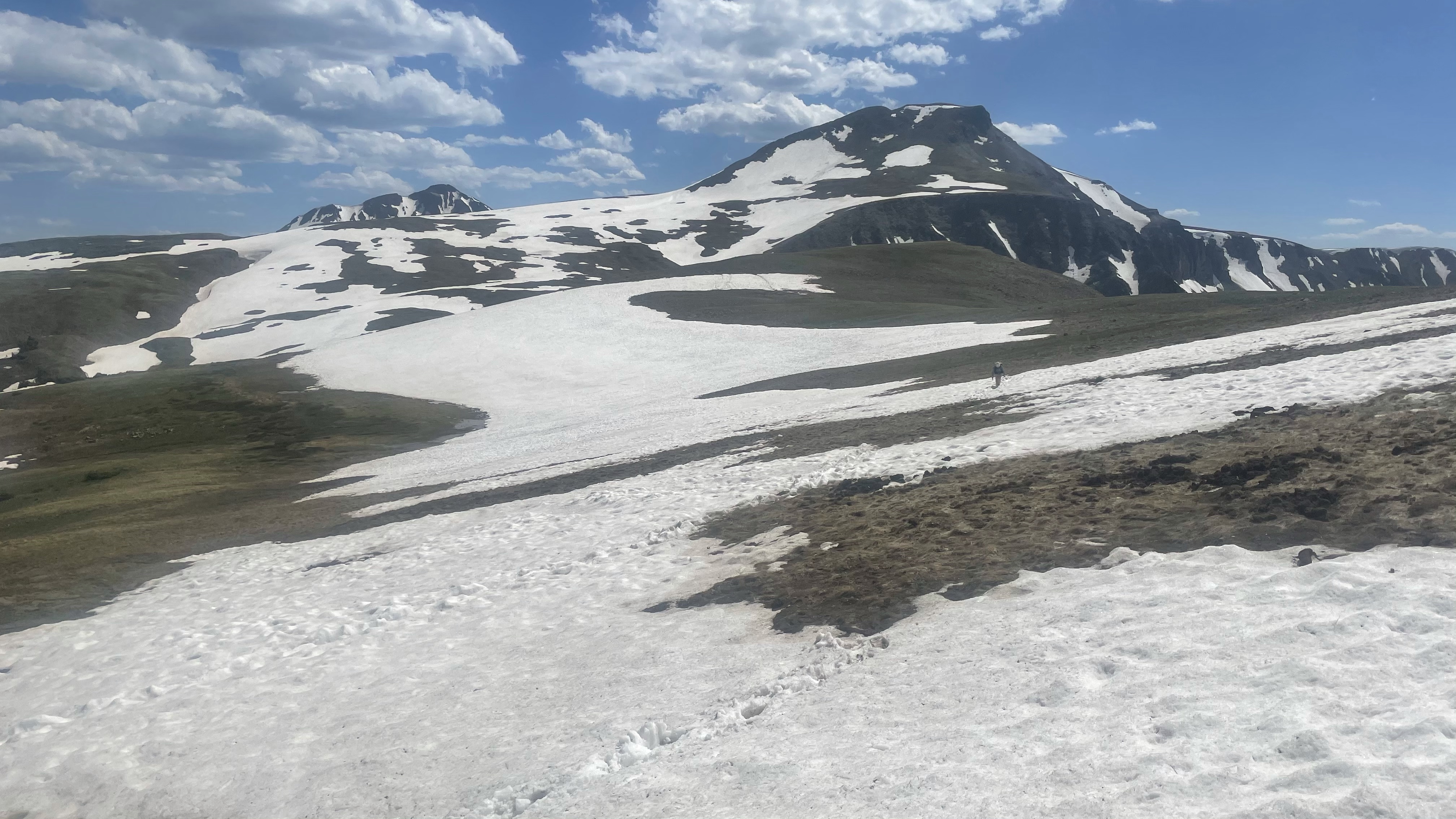 At the top of the climb sat a grassy shelf with snow melt streams and views over the rocky, snow-marbled mountains. Even though we’d only gone a mile and a half, we stopped to cook a giant pot of oatmeal, drink liters of electrolytes, and watch the peaks. I could have sat there watching all day.
