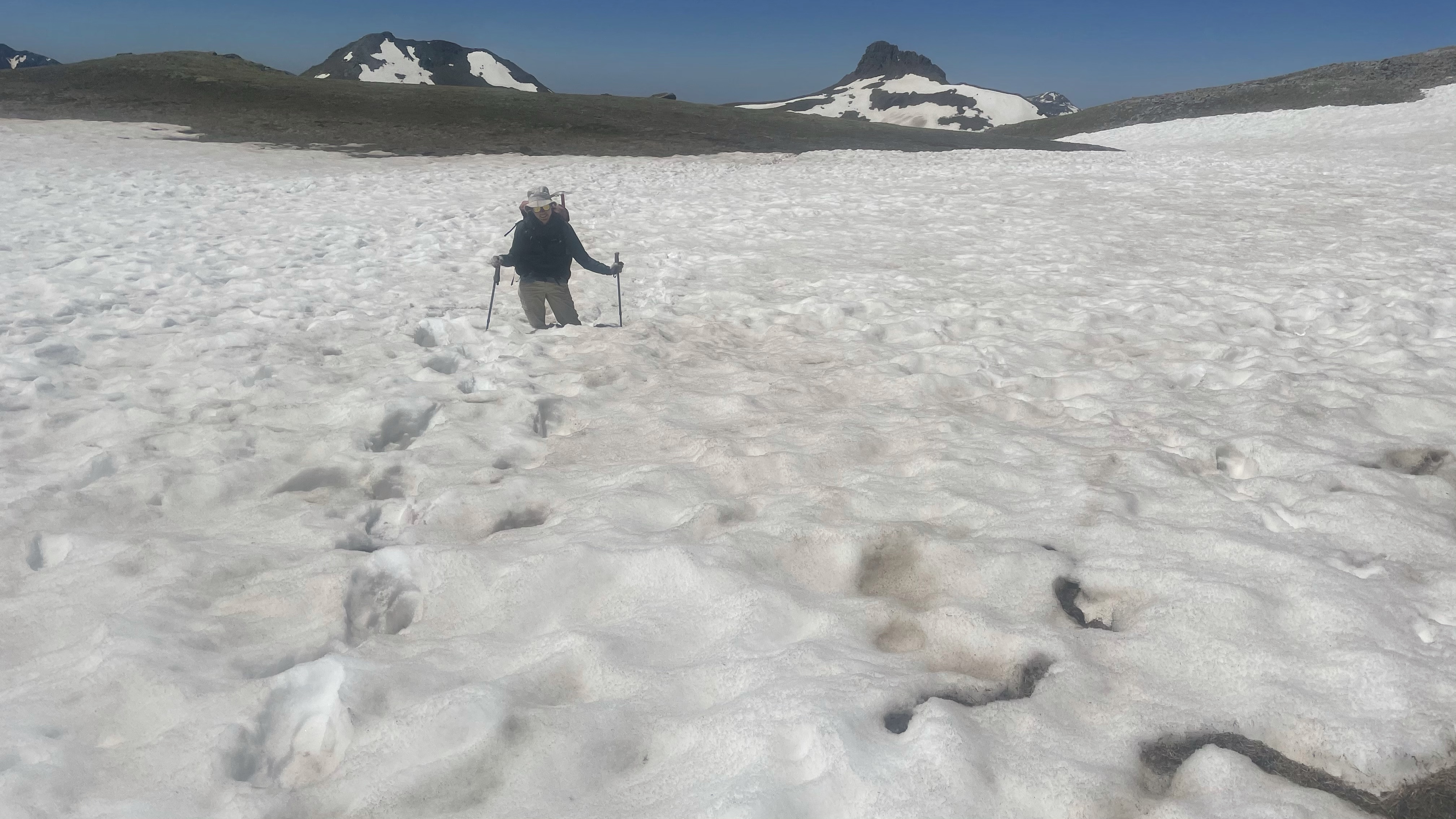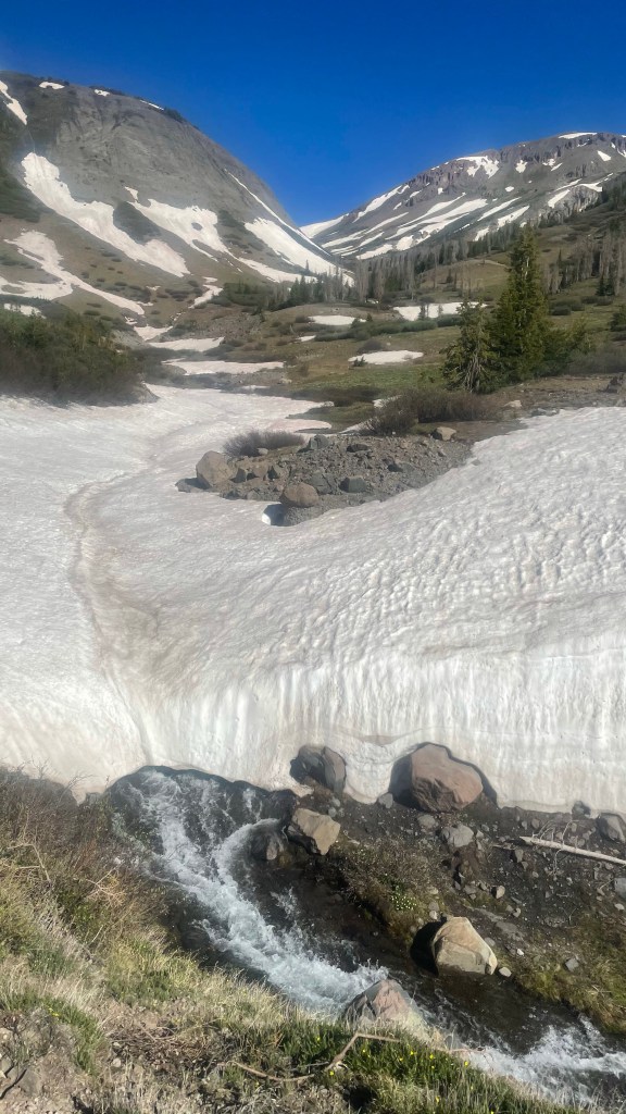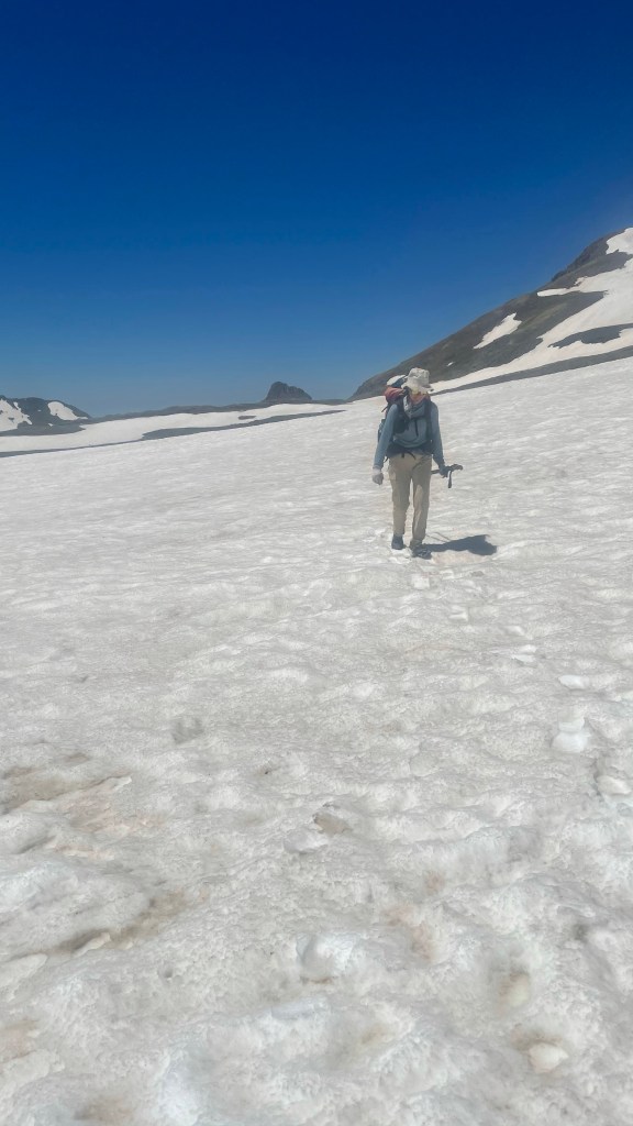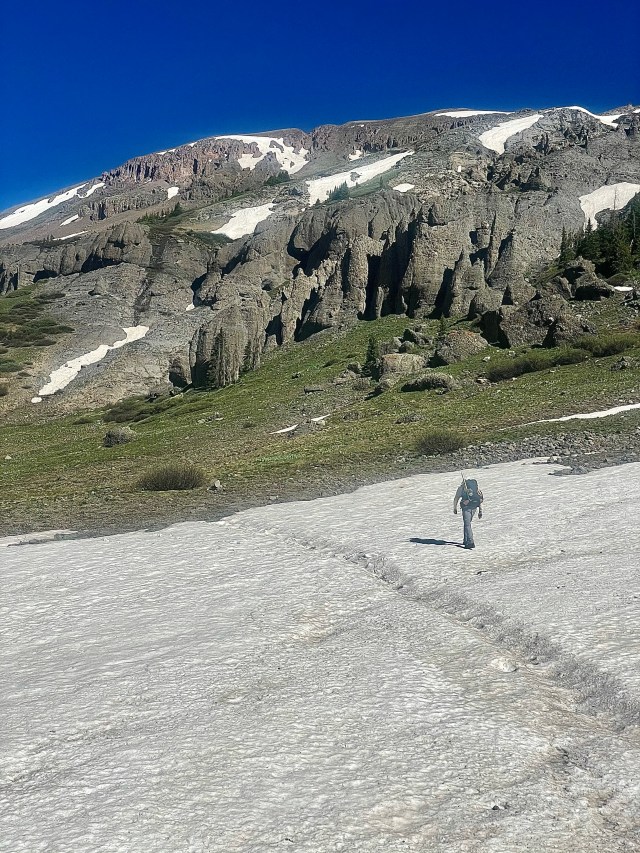 Finally, finally we dropped down switchbacks along Iron Creek, approaching an intersection of roads marking the meeting of several high and low routes. No fabulous campsite appeared, but a dry grassy bench tucked in by trees would make do well enough. Another post-snow evening ritual of laying out all the wet gear in the last rays of the sun, pulling on all the dry layers, firing up the stove. This day had only been 10 miles long, but it had been one of the most immersive yet, in terms of both beauty and effort, right behind yesterday- which had been so immersive I’d barely started to process it. A realization prickled in the back of my mind- I could do this. I could apply myself to learning mountaineering skills. I was surprised to peer deep into my thoughts and realize I actually really, really wanted to. A small coal of satisfaction and anticipation glowed warmly in my chest.