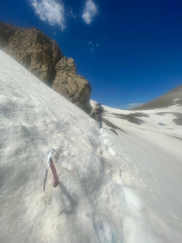 We stepped onto the snow, and where it steepened, several fresh chutes appeared – glissade tracks from the four in front. Prana set into his steep-snow rhythm with relish- plunge his axe, tap it down with the palm of his other hand, kick two good steps with several vigorous kicks, pull out his axe, repeat. It was slow going, but he basically created a sidewalk in the sky. I followed behind, reusing his axe holes, kick-settling my feet into the steps. At a rocky wall, the snow had peeled back into a tiny bergschrund, and I balanced on the mushy snow rail, reached up, and grabbed a hold on the rock face which promptly broke off in my hand. Woo!