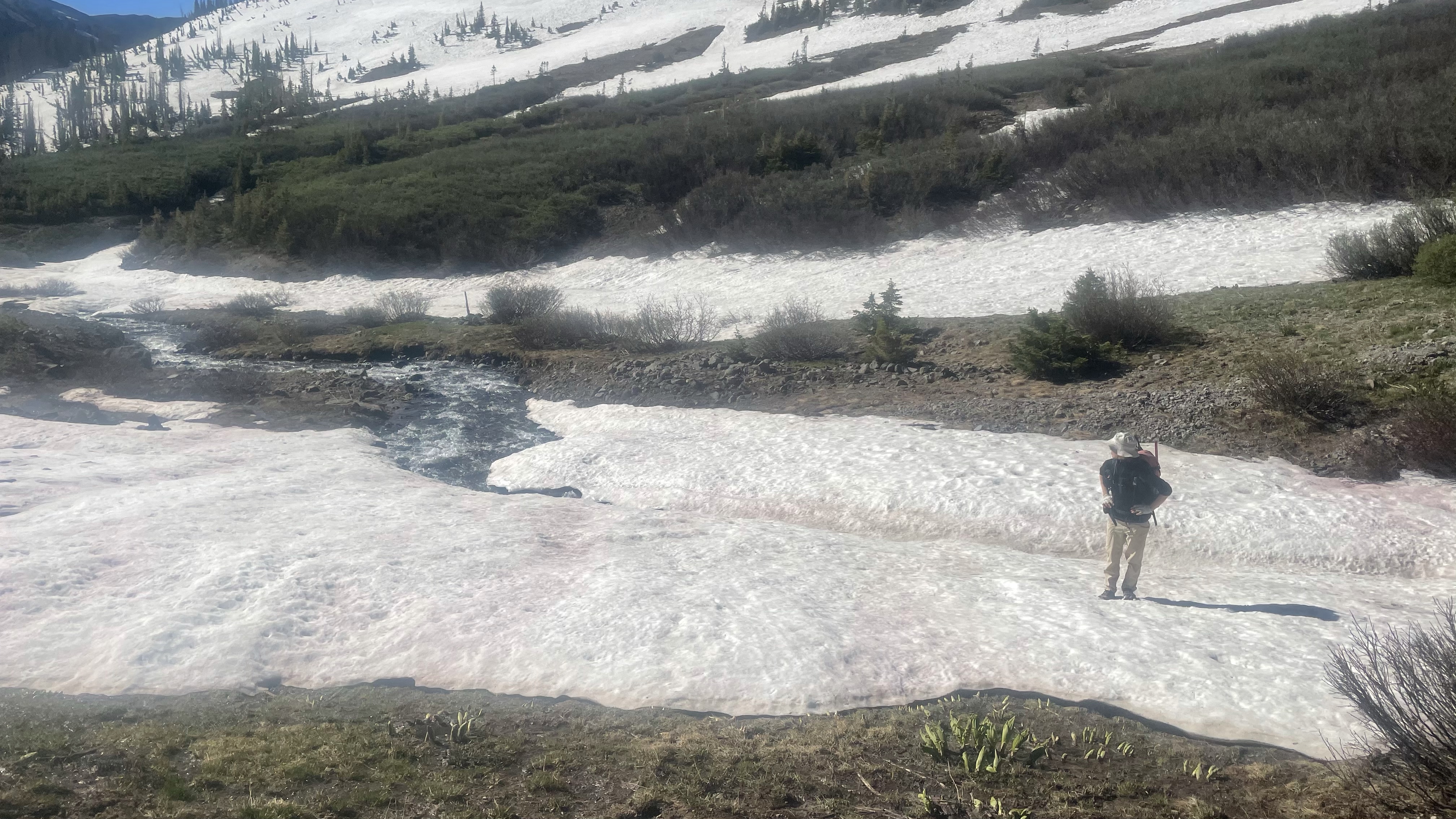 The skyline of the San Juans was spectacular, and we alternated the afternoon away with breaks on dry trail to admire the surroundings and slushing through long stretches of mashed potato snow; around Summit Peak, along Montezuma Peak, the length of Long Trek Mountain. The flatter meadows on the north facing slopes were the most effort consuming, as the postholes grew deeper and more difficult, the icy crust on the snow tearing up my legs, even through pants. We crossed the top of the couloir above Crater Lake, and considered taking a side trail to camp at it for the evening. The effort to wade through another several miles of north facing slopes, though, deterred us in the end.