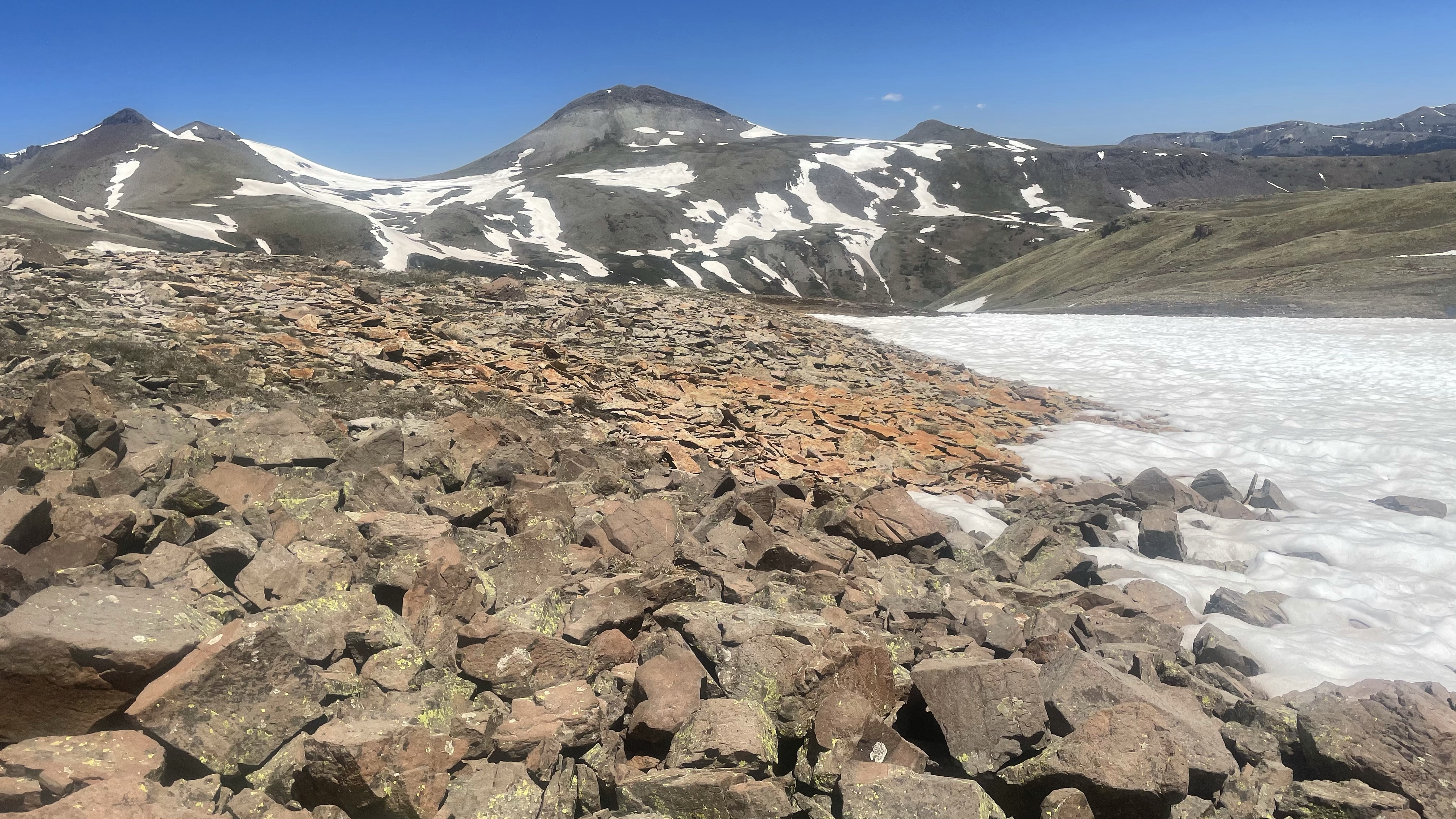 I felt much better after this, and we made quick work along the open shelf to where the trail rounded once again onto the north side of Summit Peak. It drew a stunning skyline, and the day was early enough the snow bowl below it still sat fairly firm. A ramp led around an icy teal tarn, and a low gap in the following ridge allowed a view to the east’s widespread, far-flung peaks for the first time in quite a while, accompanied by a freight train of wind. Guessing there was service here, I checked the Facebook page for updates on the accidents- we’d met the one person named back near the Rio Chama; her leg had been broken while climbing down the dry fin of land where we’d departed from the others yesterday, when a falling rock struck her and knocked her down the icy chute. Tears welled up as I read Prana the details. She’d pressed her SOS button for search and rescue, and not long after, something tumbled down the icy chute she’d been knocked into by the rock- the something was another unconscious hiker. Luckily the helicopter en route for her was able to whisk the unconscious hiker to treatment before returning for her and her husband. I couldn’t even imagine that kind of a day. A second rescue I found details of in a newspaper article, a couple cliffed-out on their descent of the same mountain, but they’d continued hiking once lowered to the valley floor; and the final rumored injuries of an out-of-control glissade I couldn’t find anything to substantiate.