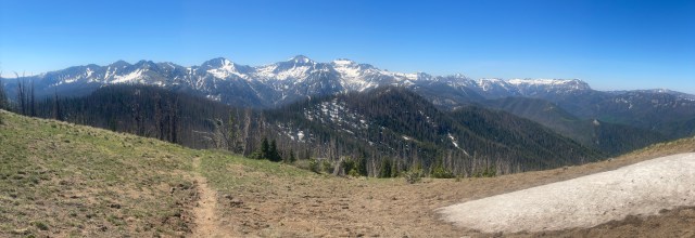 We struggled and floundered, punching through to ankles, knees, hips, waist, each step completely unpredictable on the rotting snow. Dead, fallen trees littered the lines of least resistance, forcing us to either weave and backtrack or gamble with postholing over the tangles of branches. Gradually stretches of dry trail appeared, and the thick traffic of Wolf Creek Pass grew from ant-size to beetle-sized below.