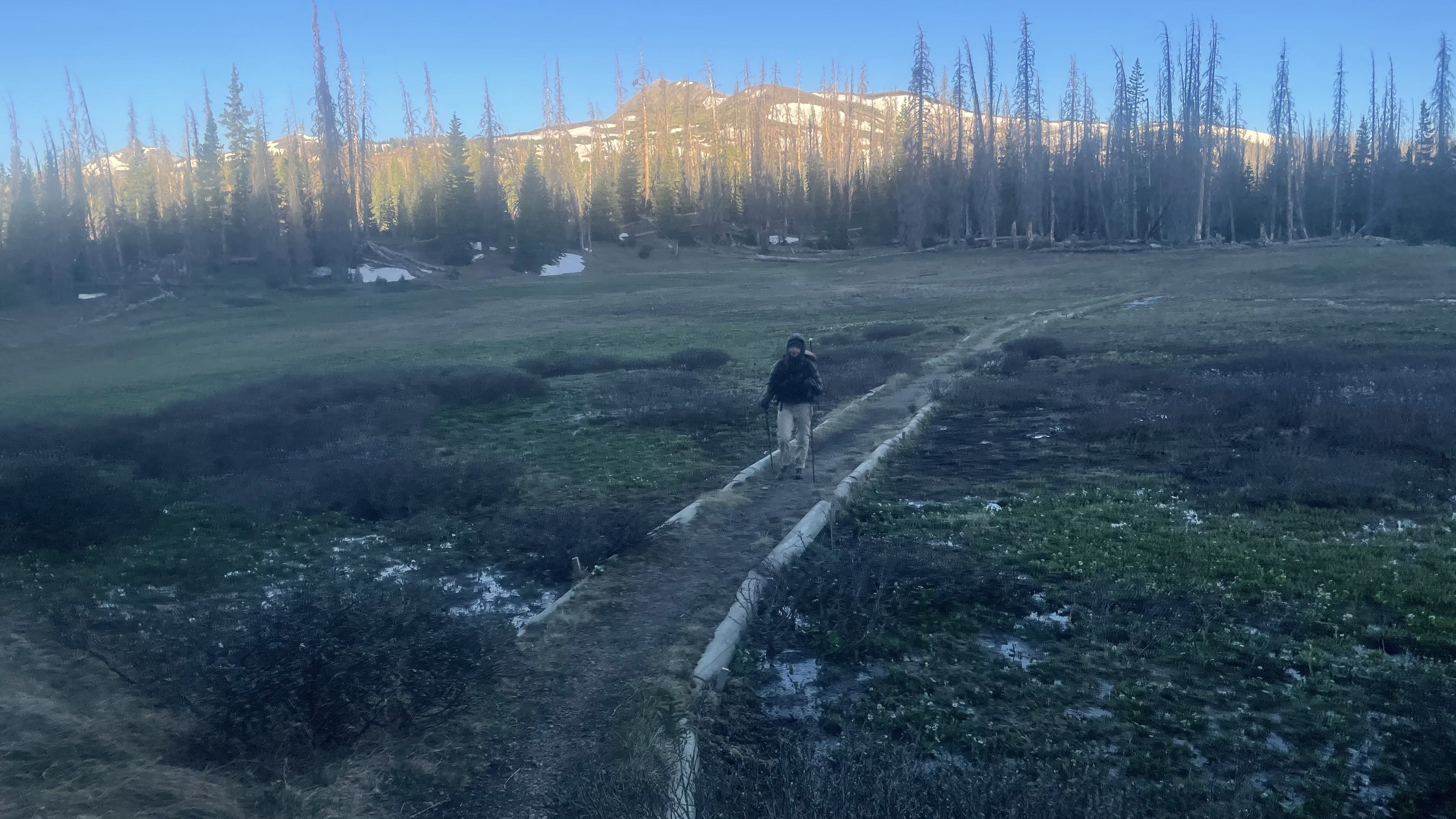 One particularly messy downfall pile marked the last navigational obstacle, and around the next switchback we met a family with small children in flip flops. “Excuse me,” I asked them with a sudden hunch, “is there any snow or trees on the trail up to here?” “No,” the mom replied, “why, is there up ahead for us?” We were free! Another half mile brought us to the meadow bordering the highway, and then to the asphalt pullout itself with it’s display proudly touting the Continental Divide.